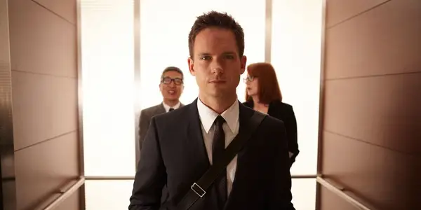 Патрік Дж. Адамс, як Майк Росс з костюмів, недалеко від камери з двома іншими людьми на задньому плані