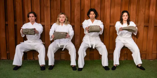 Роббі Кін (Таннер Бюкенан), Торі Ніколс (список Пейтона), Мігель Діаз (Xolo Maridueña) та Саманта Ларуссо (Мері Мусер) під час навчання витривалості в Кобра Кай 6 сезон 1