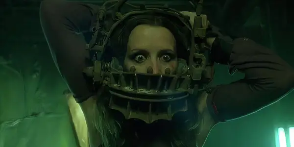 Спеціальне зображення від редактора зображень SRУ документальному фільмі Гра зміна: Спадщина пилки , Аманда Янг актор Шоні Сміт пояснює, що друга версія пастки зворотного ведмедя, незважаючи на те, що вона набагато легша, ніж оригінальна, ' був як, дуже важкий, і мені довелося тримати його з депресіром язика в зубах . У Сміта також була лихоманка, яка ще більше ускладнила діяльність , але вона просунулася і використовувала свій фізичний дискомфорт, щоб повідомити про її виступ.